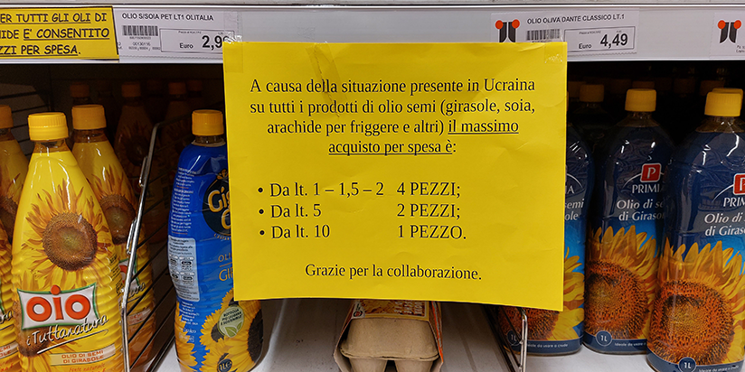 දැන් යුද්ධයේ බලපෑම ඉතාලි ජන ජිවිතයට සුපර්මාකට් එක ඇතුලෙන් බලපාන්නට පටන් ගෙන තිබේ. සූරියකාන්ත තෙල් මිල 120 % කින් ඉහළ ගොස් තිබේ. සූරියකාන්ත තෙල් ලීටරයක මිල යුරෝ 3.50 ක් පමණ වන අතර මිලදී ගැනීම් සීමා සහිත කර තිබේ. බොහෝ විට ඉදිරි සති කිහිපය ඇතුළත යුද වාතාවරණය සමනය නොවුනොත් ඉතාලිය තුළ සූරියකාන්ත තෙල් ලීටරයක මිල ඔලිව් තෙල් ලීටරයක මිල ට වඩා අධික වනු ඇත.